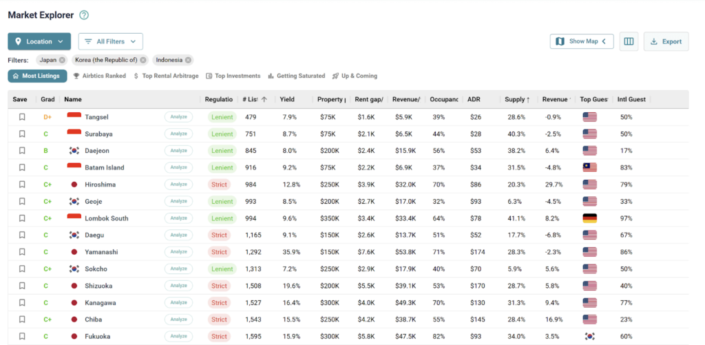 Investors can compare Airbnb markets across Asia by using standardized, city-level data on revenue, occupancy, ADR, property prices, active listings, and regulations. The Airbtics Market Explorer allows detailed comparisons based on key Airbnb data analytics to identify the strongest opportunities across countries and cities.