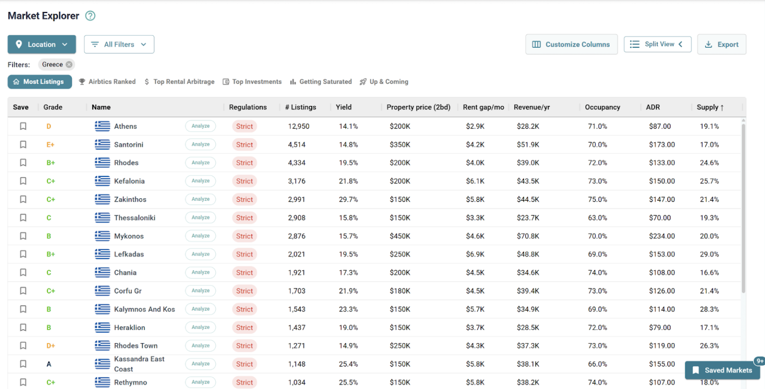 Once you’ve decided on the best country in Europe for Airbnb investing according to your personal preferences and criteria, you can use the Airbtics Market Explorer to find the top-performing local cities.